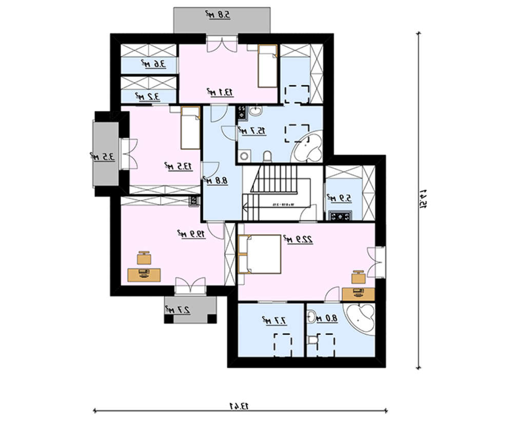 Второй этаж — ночная зона. Здесь находятся апартаменты владельца дома с гардеробом, собственной ванной и рабочим кабинетом. Две удобные спальни объединены балконом и общим санузлом.