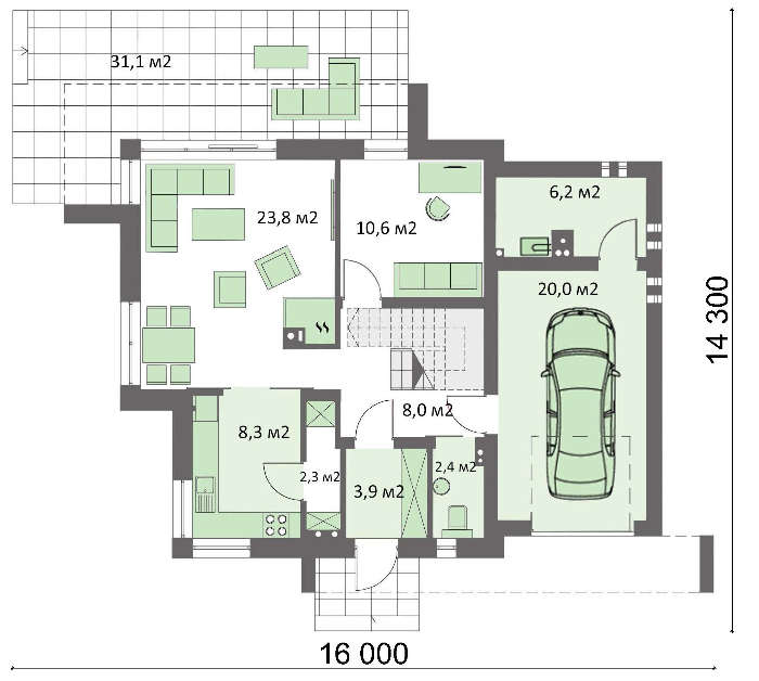 Проект содержит три раздела – АрхитектурныйКонструктивный и Инженерный: водоснабжение, отопление, вентиляция, канализация, электроснабжение (приобретается за дополнительную плату) + Пояснительная записка.